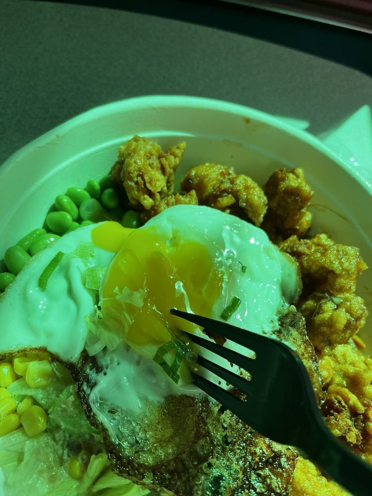 Stir-fried kimchi, rice, sesame oil and scallion. Add protein for an additional charge.